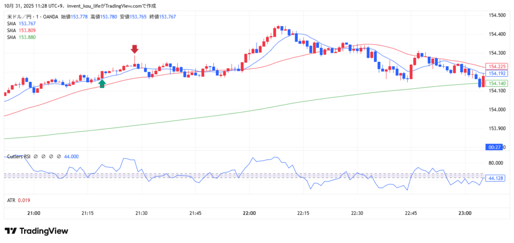 • エントリー根拠:この日は米GDPの好結果を受け、NY時間開始前から強い上昇トレンドが発生していました。1分足チャートはSMA200を明確に上回り、絶好の「買い場」探し。SMA10またはSMA34までの「押し目」を冷静に待ち、反発を確認してから「買い」でエントリー。この王道パターンで3回の利確(+11pips x 3)を重ねることができました。RSIも50以上をキープしており、買いの勢いが強いことを確認できました。